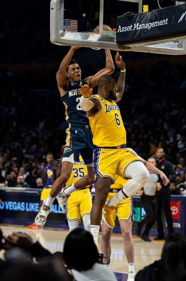第二节比赛,湖人连续出现失误,让鹈鹕队打成反击,分差被拉开到6分。这一节开始湖人队打得有点随意,但在限制锡安上面,詹姆斯防突放投,让锡安几次进攻都没打成。瓦兰丘纳斯和麦科勒姆投篮都被防住了,海耶斯的投篮被威少封盖。威少冲击篮下得分,将分差缩小到5分。