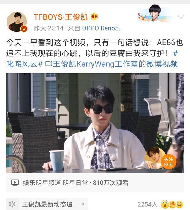 王俊凯得知偶像送给他一份这么珍贵的礼物和心意,随即在微博发文回应,表示自己看到周杰伦送给自己的礼物后激动到手抖,表示AE86都追不上他现在的心跳了!