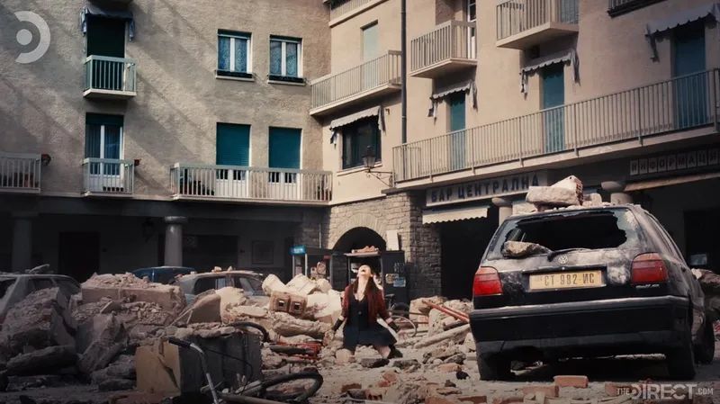 第二个镜头是快银皮特罗牺牲之后,旺达感受到了哥哥的死,发出痛苦的尖叫,不过正片中的背景并不是在废墟中,而是在奥创计划将索科维亚升到空中的装置周围;