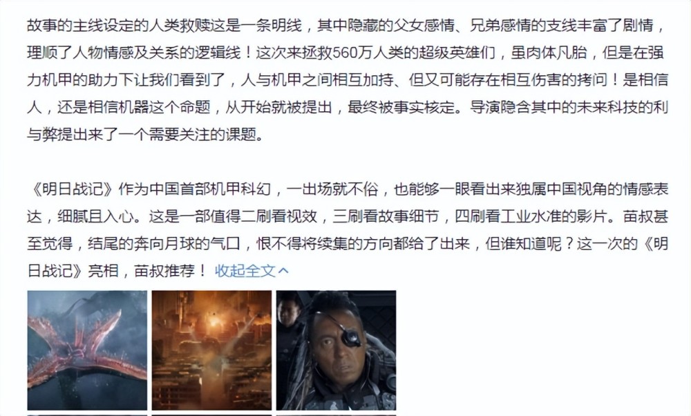 第三个原因,7月31日,《明日战记》举办了一场超前点映,看过的观众和影评人都给予很高评价。比如有影评人连夜发长文称赞电影“作为中国首部机甲科幻,一出场就不俗,也能够一眼看出来独属中国视角的情感表达,细腻且入心。这是一部值得二刷看特效,三刷看故事细节,四刷看工业水准的影片。”而翻了一下社交平台上的打分,基本都是在四星半,确实口碑不错,要比《独行月球》的口碑更好。