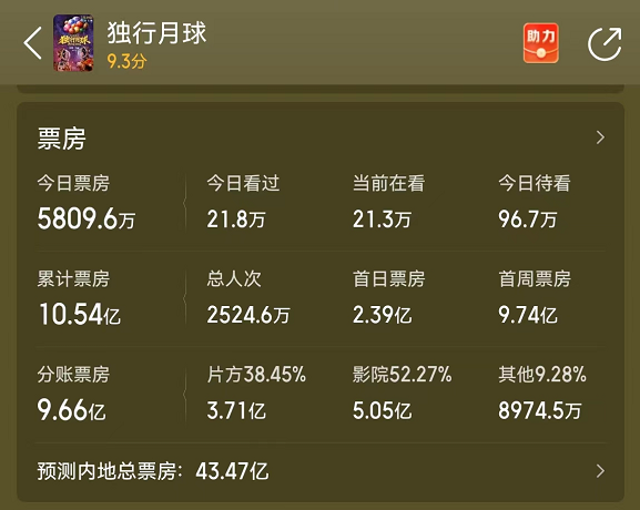 截止到发稿,上映第四天的《独行月球》票房已经超过10亿,增速非常快,周末两天的单日票房都超过3亿。