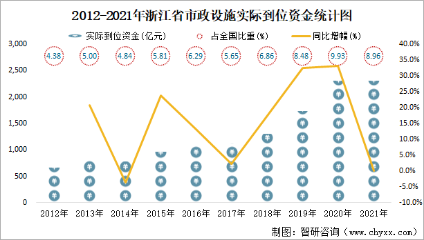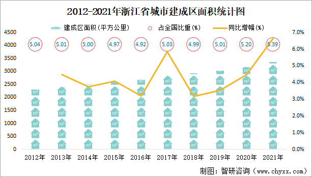 2021年年末,浙江省城市建成区面积3366.42平方公里,同比增长6.63%。
