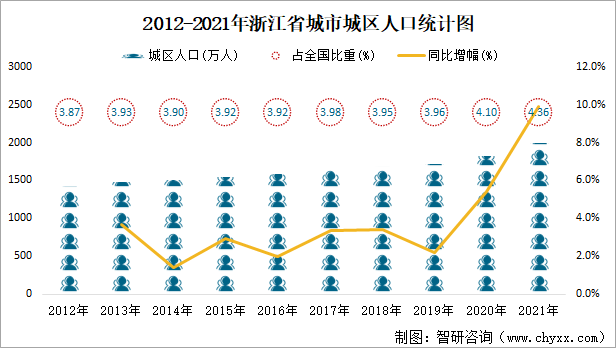 2021年年末,浙江省城市城区人口1996.16万人,同比增长9.9%。