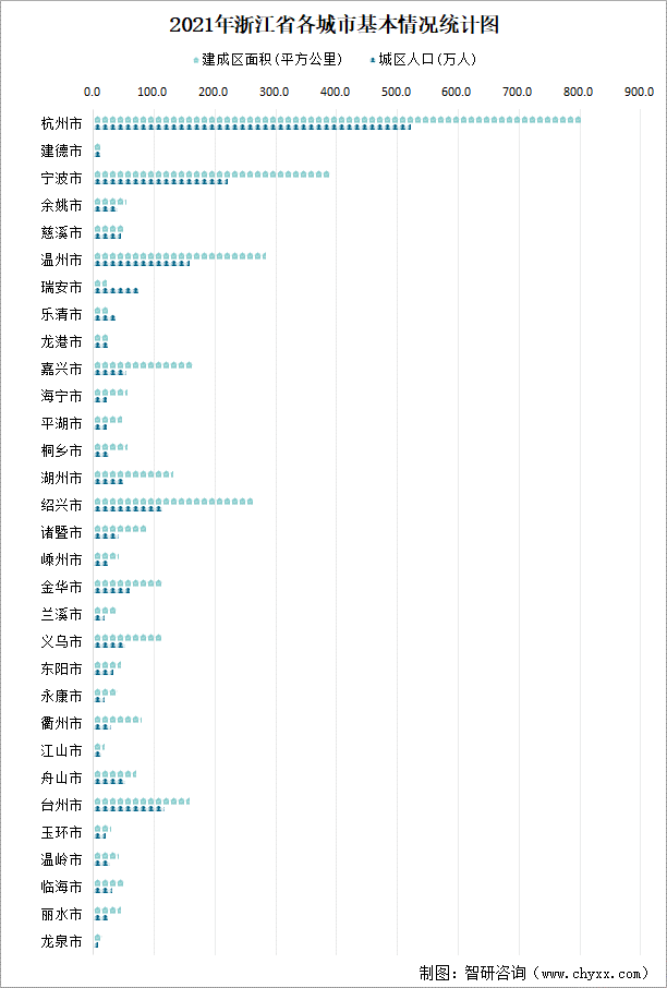 2021年浙江省31座城市中,杭州市建成区面积与城区人口均为最高,宁波市、温州市建成区面积与城区人口紧随其后,建德市建成区面积最少,龙泉市城区人口最少。