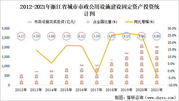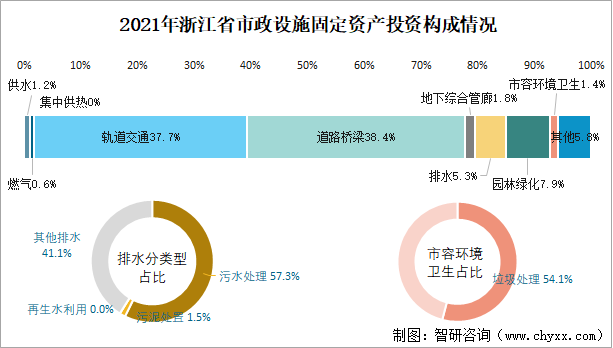 2021年,浙江省市政设施完成投资2077.67亿元,同比下滑3.53%。其中,道路桥梁占城市市政设施完成投资的比重最大,为38.4%;轨道交通、园林绿化、其他投资分别占37.7%、7.9%和5.8%;集中供热占比最小,为0.01%。