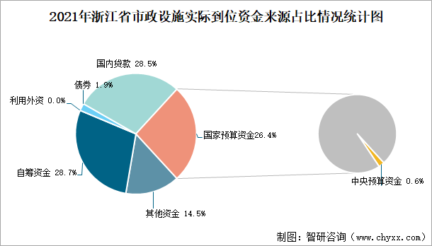 2021年,浙江省市政设施实际到位资金合计2309.56亿元。其中,上年末结余资金218.16亿元,同比下滑24.29%;本年资金来源小计2091.4亿元,同比增长3.47%。其中,自筹资金占实际到位资金小计的比重最大,为28.7%;其次是国内贷款、国家预算资金、其他资金和债券的占比分别为28.5%、26.4%、14.5%和1.9%。