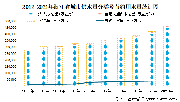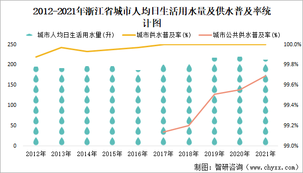 2021年,浙江省城市供水总量467101.58万立方米,同比增长10.14%,其中公共供水总量占城市供水总量的96.34%,自建设施供水总量占城市供水总量的3.66%;城市供水管道长度98151.51公里,同比增长8.11%;城市人均日生活用水量212.21升;供水普及率100%(其中城市公共供水普及率99.69%)。