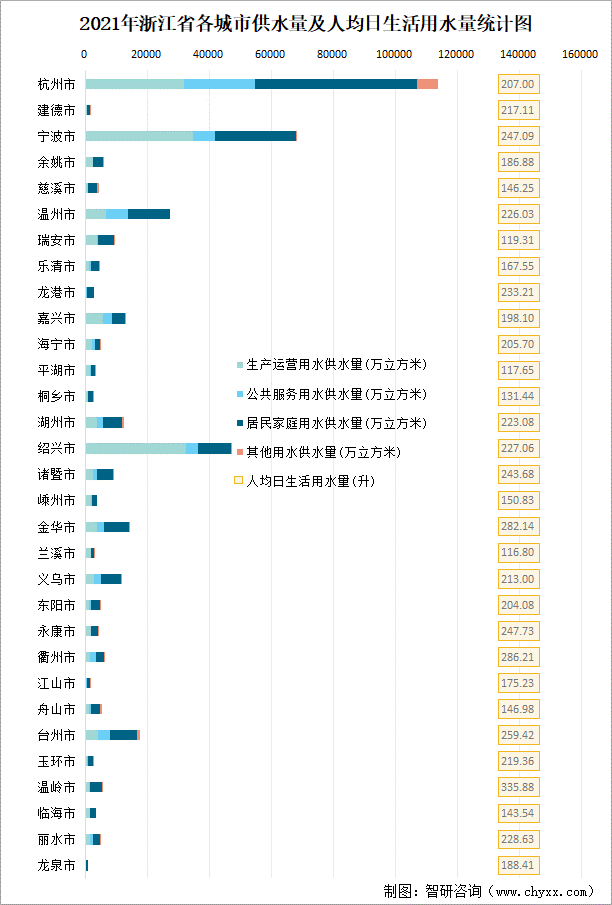 2021年浙江省31座城市中,15个城市人均日生活用水量大于等于浙江省平均值,其中温岭市最高,人均日生活用水量为335.88升,衢州市、金华市排进前三,16座城市人均日生活用水量小于平均值,兰溪市最低,为116.8升。