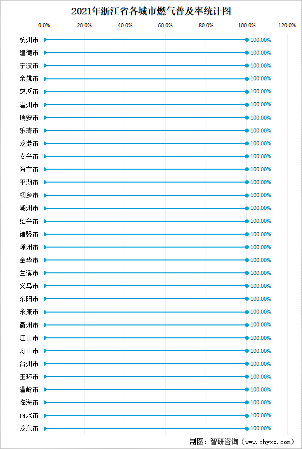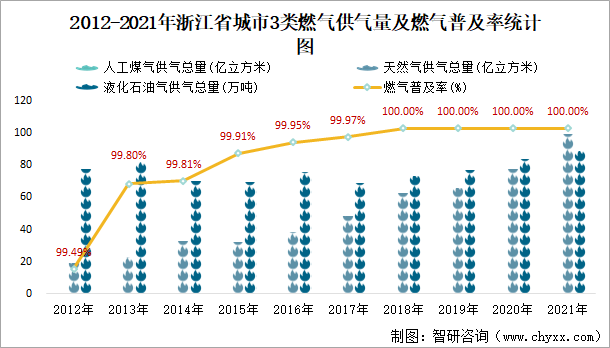 2021年,浙江省城市暂无人工煤气供应;天然气供气总量99.2亿立方米,同比增长27.84%;液化石油气供气总量88.66万吨,同比增长5.66%;燃气普及率为100%,浙江省31座城市燃气普及率等于100%。