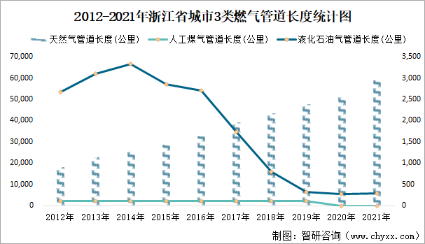 2021年,浙江省城市暂未发布人工煤气管道长度数据;天然气管道长度58806.04公里,同比增长15.62%;液化石油气管道长度281.37公里,同比增长6.16%。