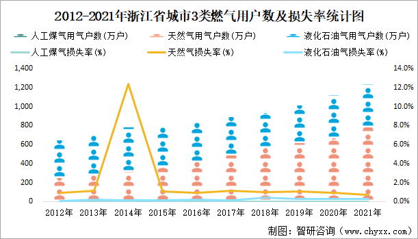 2021年,浙江省暂无人工煤气相关数据;城市天然气用气户数778.62万户,同比增长16.5%,天然气损失率0.69%,比上年减少0.24个百分点;城市液化石油气用气户数455.19万户,同比增长1.55%,液化石油气损失率0.29%,比上年增加0.03个百分点。
