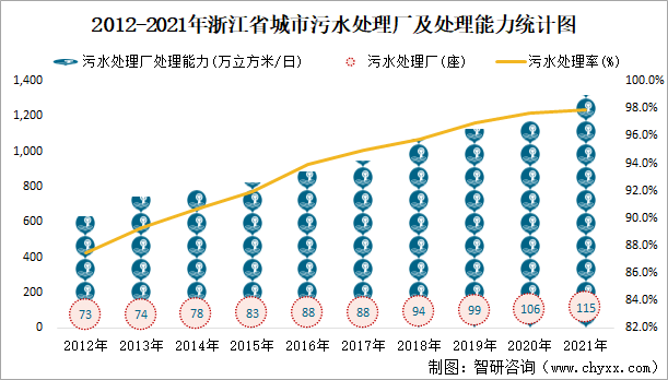 2021年年末,浙江省城市排水管道总长度6.07万公里,同比增长15.46%;污水处理厂处理能力1317.3万立方米/日,同比增长12.22%;污水处理率97.92%,比上年增加0.23个百分点;污水处理厂115座,比上年增加9座污水处理厂;城市生活污水集中收集率66.84%。