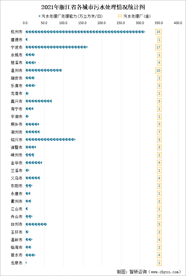 2021年浙江省31座城市中,污水处理厂处理能力排名前三的城市是杭州市、宁波市、绍兴市,其污水处理厂处理能力分别为311.9万立方米/日、161.6万立方米/日、130万立方米/日;污水处理厂数量最多的3座城市分别为宁波市、杭州市、温州市。