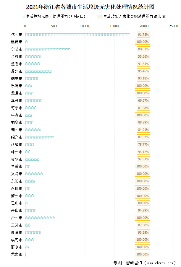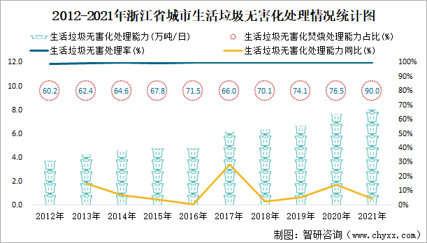 2021年,浙江省城市生活垃圾无害化处理量1531.1万吨,同比增长5.97%;生活垃圾无害化处理率100%,与上年相比保持一致;生活垃圾无害化处理能力8万吨/日,同比增长4.54%,其中,焚烧处理能力占比为90%。