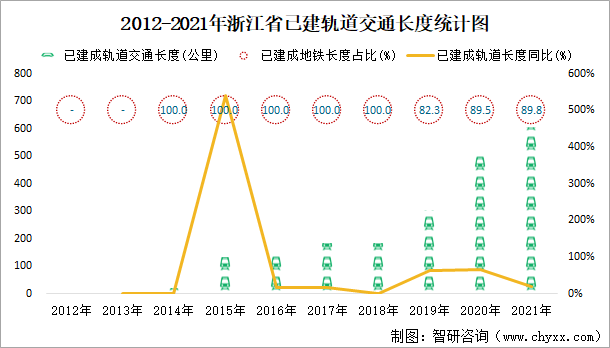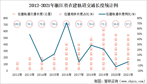 2021年年末,浙江省城市已建成轨道交通606.9公里(占全国已建成轨道交通长度比重为7.1%),同比增长19.51%,其中已建成地铁长度占比89.8%;在建轨道交通553.1公里(占全国在建轨道交通长度比重为10.7%),同比下滑2.5%,其中在建地铁长度占比57.2%。