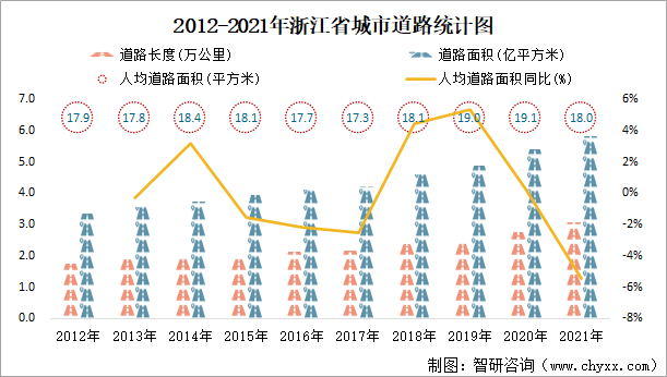 2021年年末,浙江省城市道路面积5.8亿平方米,同比增长7.89%;城市道路长度3.1万公里,同比增长11.63%;2021年浙江省城市人均道路面积18平方米(低于全国城市人均道路面积),同比下滑5.47%。