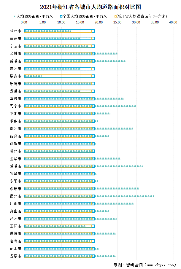 2021年浙江省31座城市中,10座城市人均道路面积小于全国人均道路面积,9座城市人均道路面积小于浙江省人均道路面积;排名前3的城市分别为衢州市、兰溪市、永康市,瑞安市人均道路面积最少,只有4.58平方米。