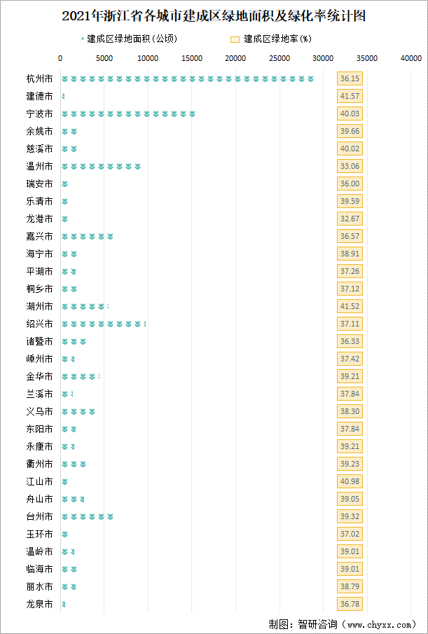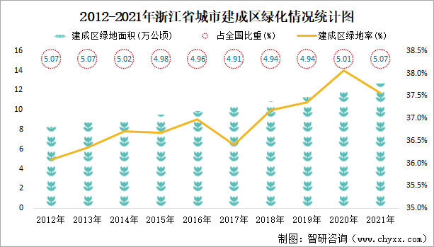 2021年年末,浙江省城市建成区绿地面积12.64万公顷,同比增长5.2%;2021年浙江省城市建成区绿地率37.56%,比上年减少0.51个百分点。