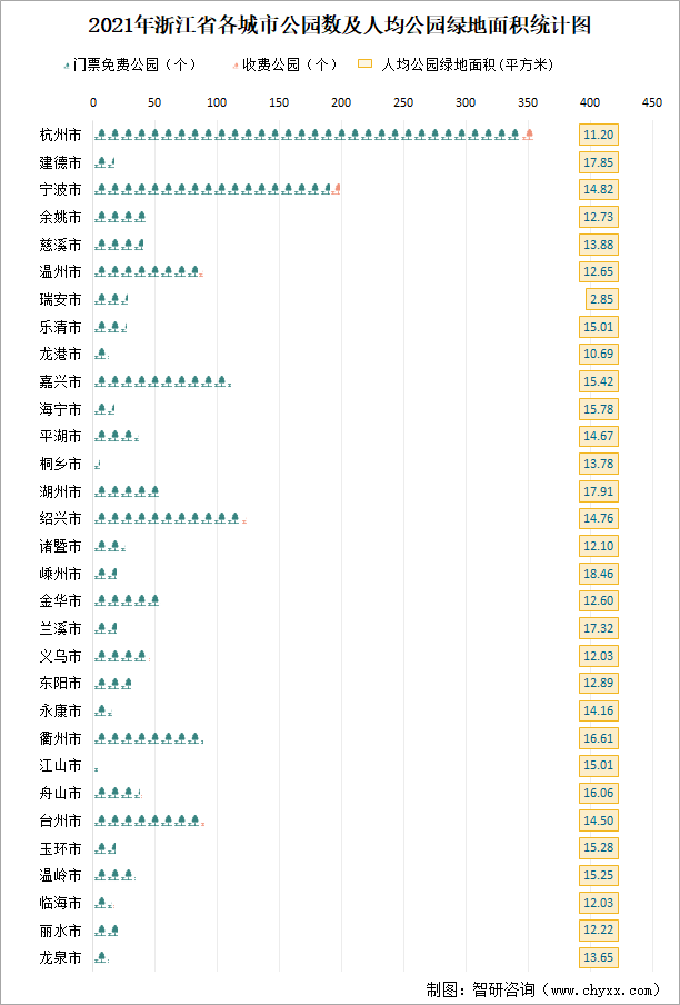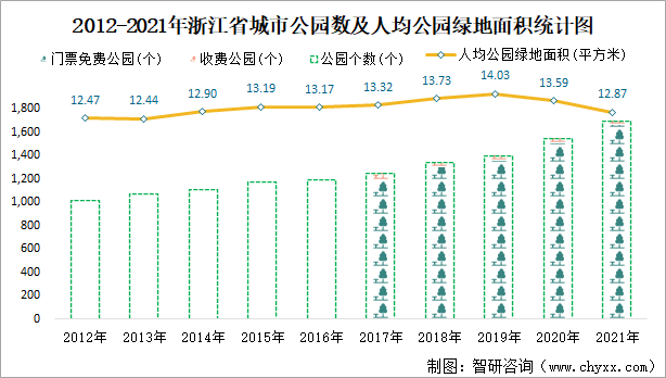 2021年,浙江省城市人均公园绿地面积12.87平方米,比上年减少0.72平方米;2021年浙江省拥有公园个数1699个,比上年增加152个,增幅9.83%,其中门票免费公园占比97.7%。