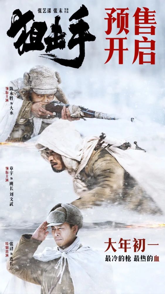 1月21日,由张艺谋、张末导演执导,陈永胜、章宇领衔主演,张译特别出演的《狙击手》发布传承版海报和“上战场”特别视频。传承版海报背景中大面积雪地的留白不仅透露出冬季战场的寒冷与残酷,主演陈永胜饰演的年轻战士大永趴在雪地之上,手持没有瞄准镜的狙击枪对准敌方;章宇饰演的班长刘文武身披白色斗篷穿梭于大雪之中;张译特别出演连长一角,向五班所有战士致敬军礼。