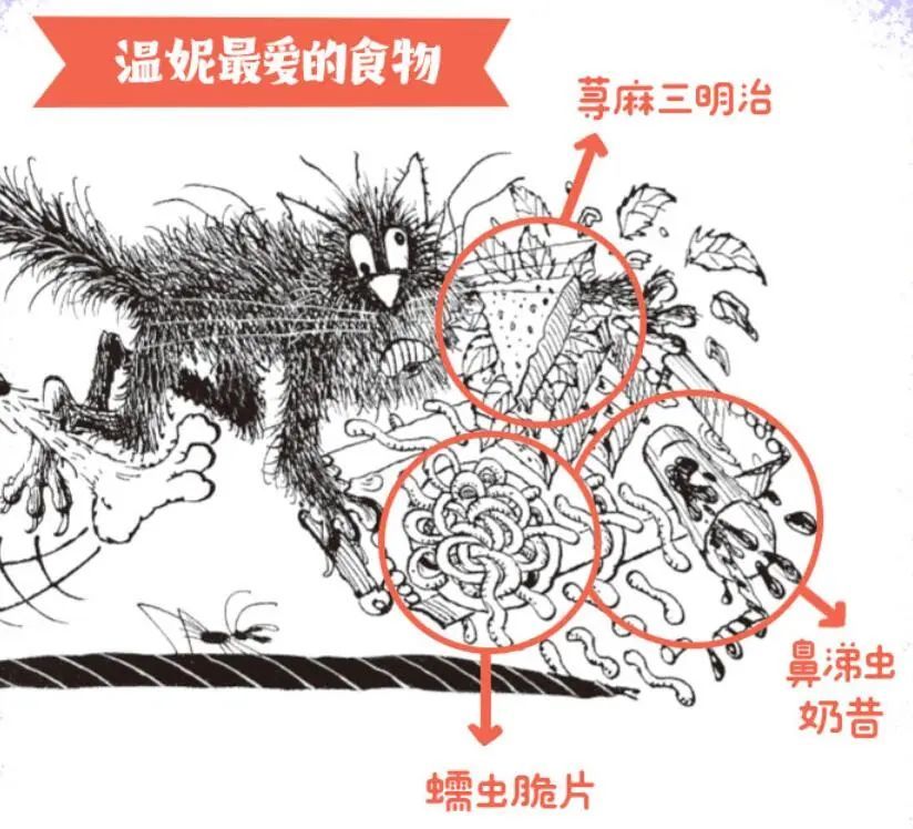 作为女巫,温妮的食谱可不一般:爱吃的食物有蠕虫脆片、大象脚指甲饼干、油炸苍蝇馅饼、加了蜗牛糖浆的麦片粥、鱼卵做的蛋奶酥、鼻涕虫奶昔……