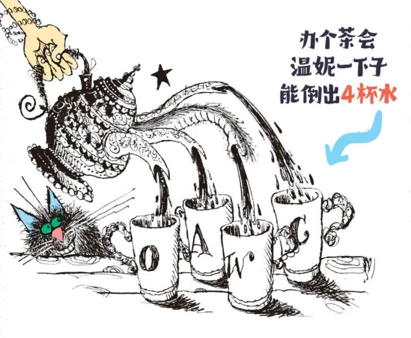 机智的温妮变出了一张方桌,又变出了一个有四个壶嘴的茶壶,这样大家都能坐在最好的位置,喝到第一杯茶了!