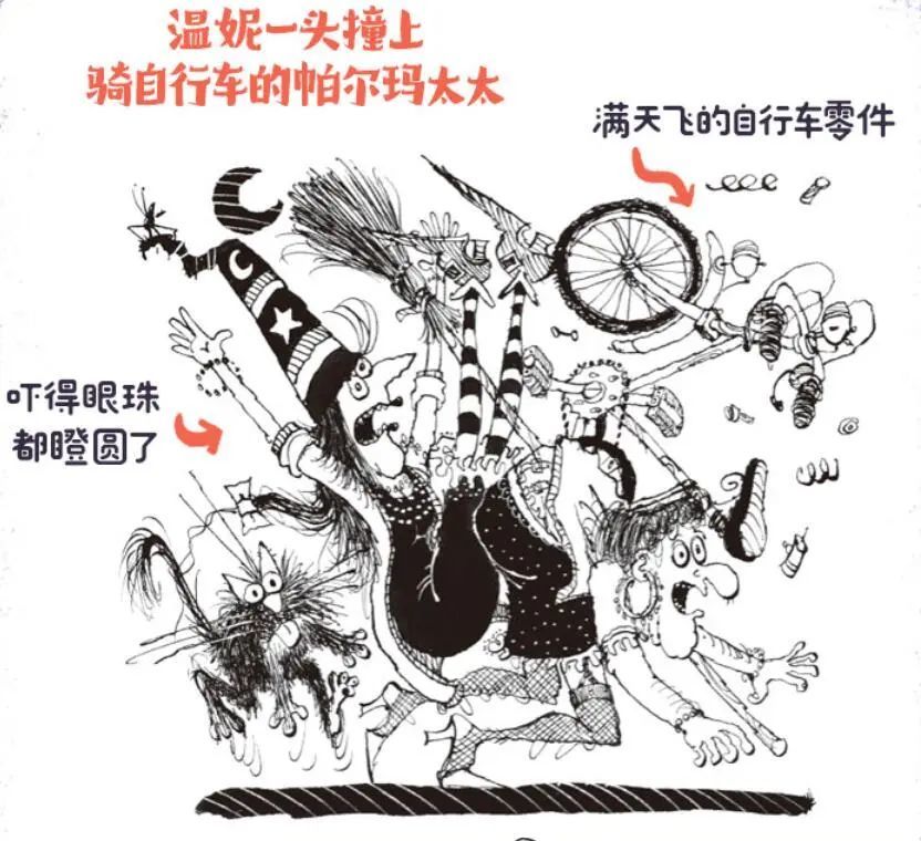 有一次,温妮骑扫帚飞行时,因为天太黑,撞上了帕尔玛太太的自行车。于是,她给扫帚和自行车都安上了彩灯。
