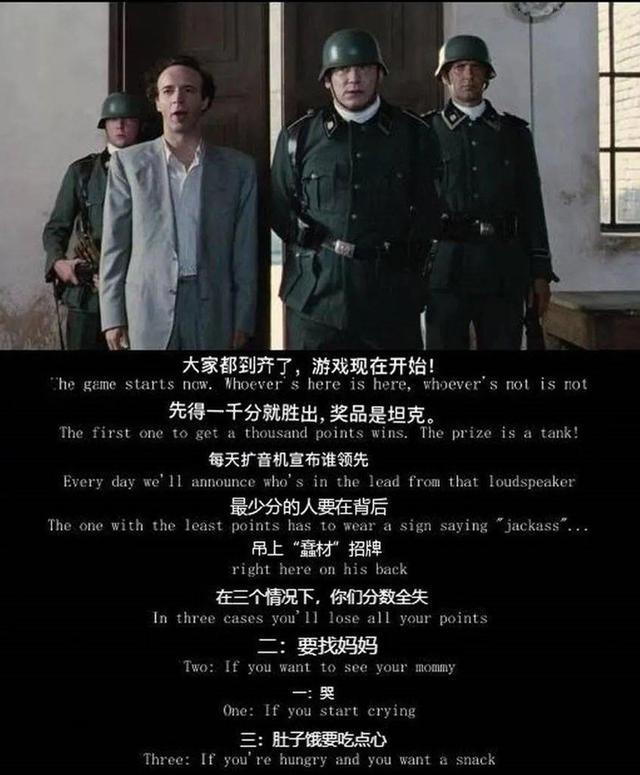 无论在集中营遭受怎样的对待,圭多面对儿子都是笑脸,告诉儿子每天积了多少分,交代儿子要藏好,不然被军官找到就被扣分。