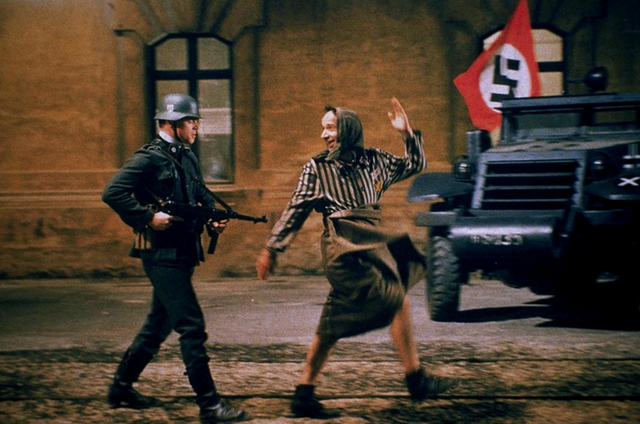之后,圭多故意迈着夸张滑稽的步子走向了生命的终结!