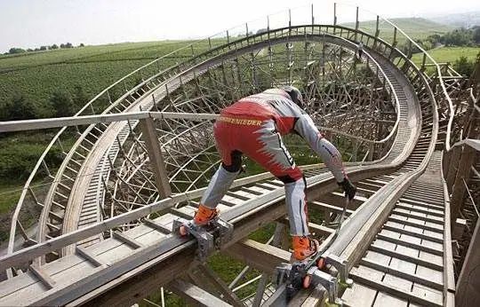 跨界融合毫无疑问是创新的源泉,主题娱乐项目中,过山车成为主题乐园的重头戏,估计有很多人有要在过山车上走一遭的想法,比如此前就有一名36岁的世界顶尖轮滑高手德克·奥尔在德国斯图加特一公园完成了一项壮举:他脚蹬特制的轮滑鞋,竟在短短60秒钟内以高达90公里的时速,风驰电掣般滑完长达860米的巨型过山车滑轨,从而创造了一项极限轮滑的世界纪录。