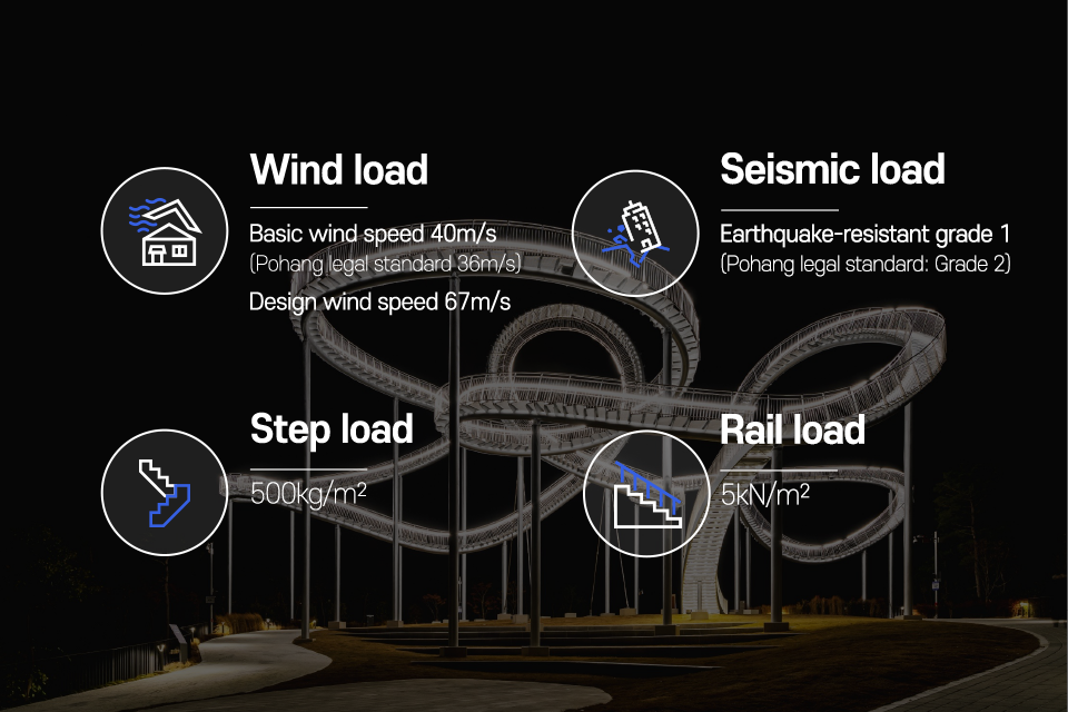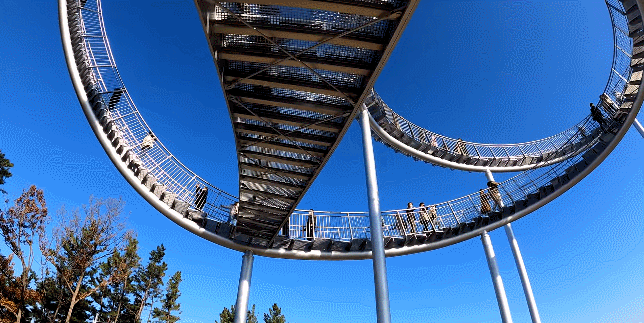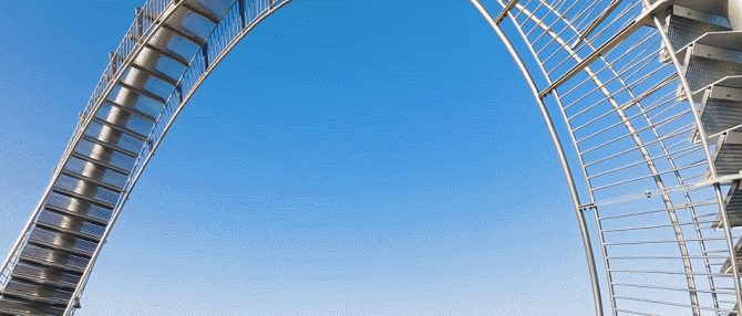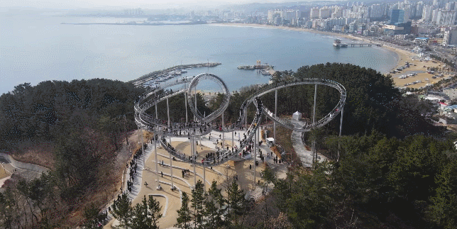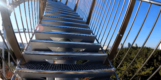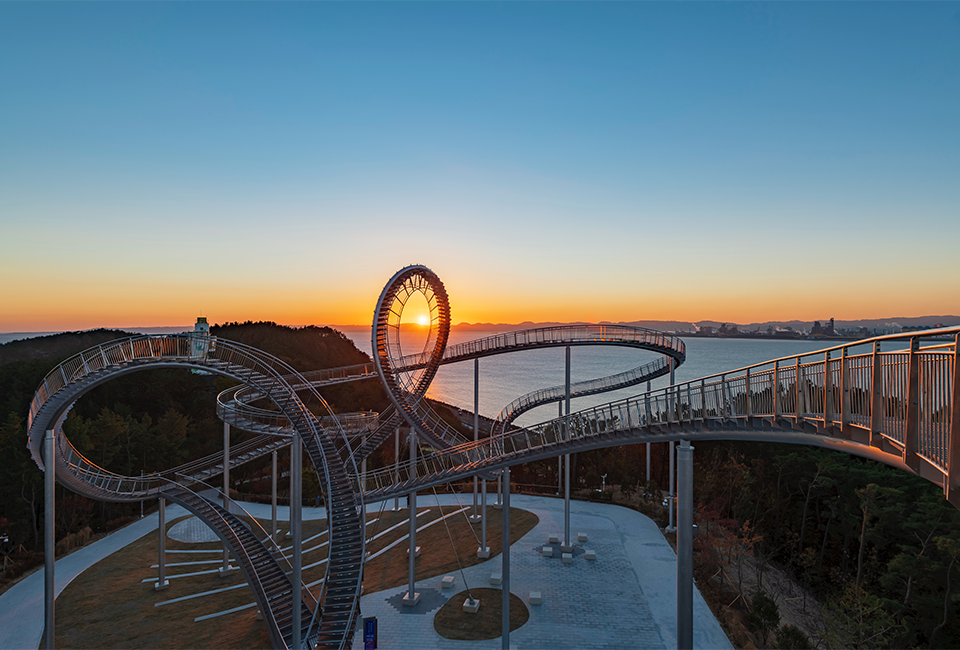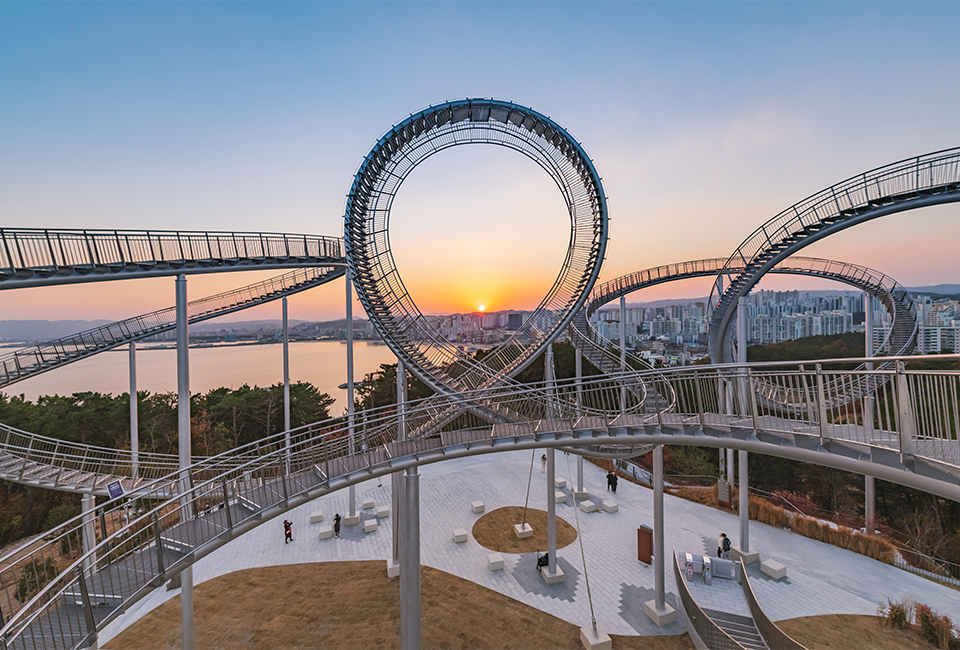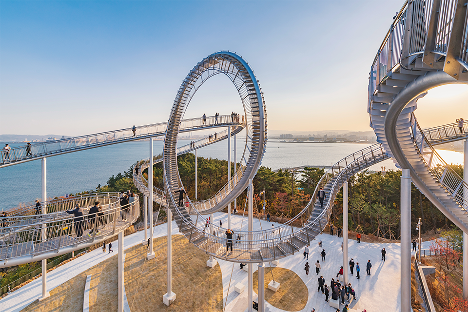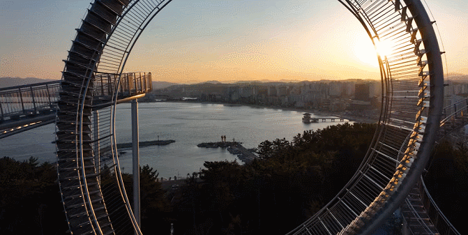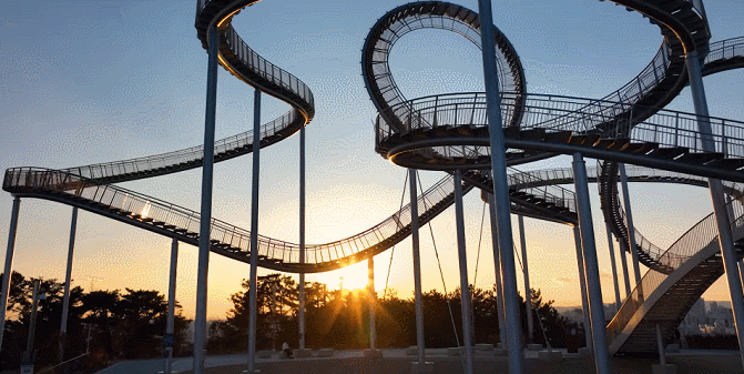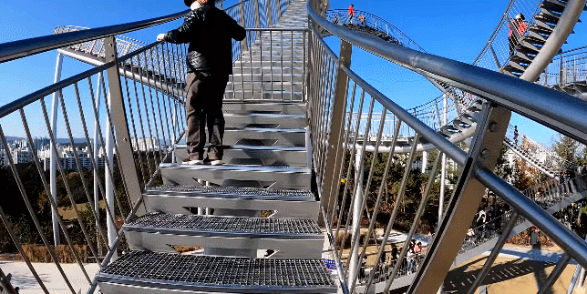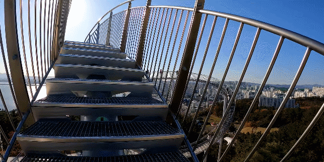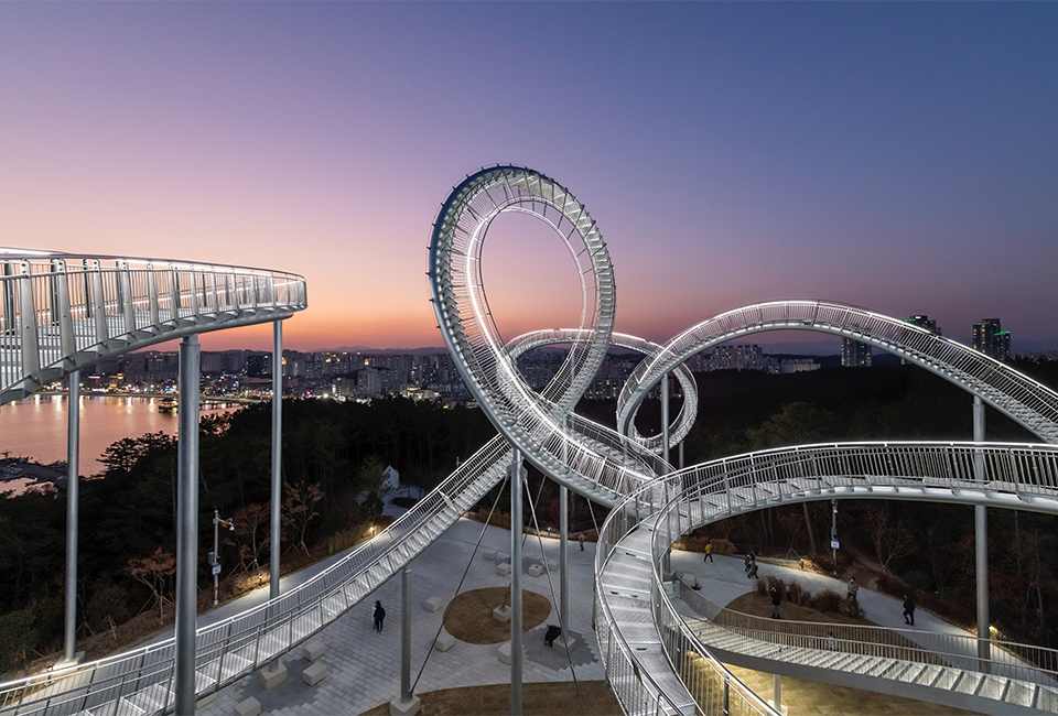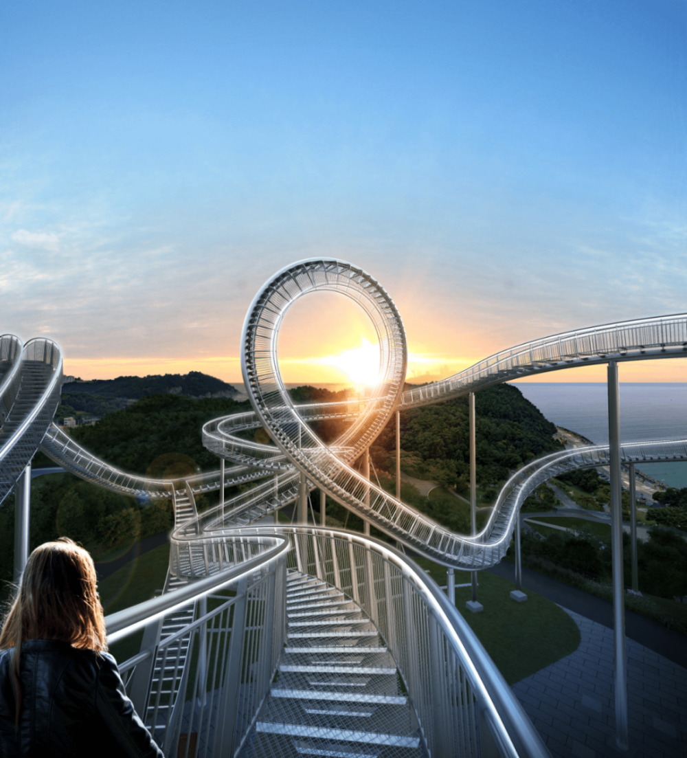 这座纪念性的楼梯蜿蜒盘旋,立面类似于浦项的过山车,除了最里面的环形道路,行人几乎可以完全到达。这是韩国有史以来安装的最大的当代公共雕塑。这是一件在韩国很难看到的新概念步行体验艺术装置,是一件从观看者只能看不能碰转变为直接可以走进艺术、与艺术融为一体的雕塑作品,也是代表浦项乃至整个韩国的地标性建筑。
