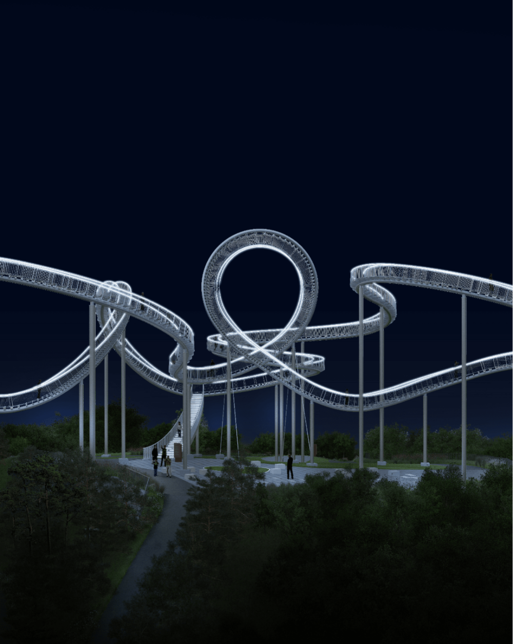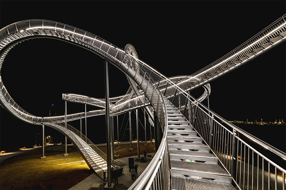 项目由享誉世界的德国夫妻艺术家Heike Mutter和Ulrich Genth设计。作为2011年两人在杜伊斯堡的项目“老虎与海龟-魔法山”的后续项目,“太空漫步”是在水泥地基上用镀锌钢板和不锈钢板建造的,从策划到完成历时两年零七个月,长57米、宽60米、高25米、轨道全长333米、使用约 317 吨钢材,造型流畅、曲折多变,并嵌入了一排排的 LED 灯。