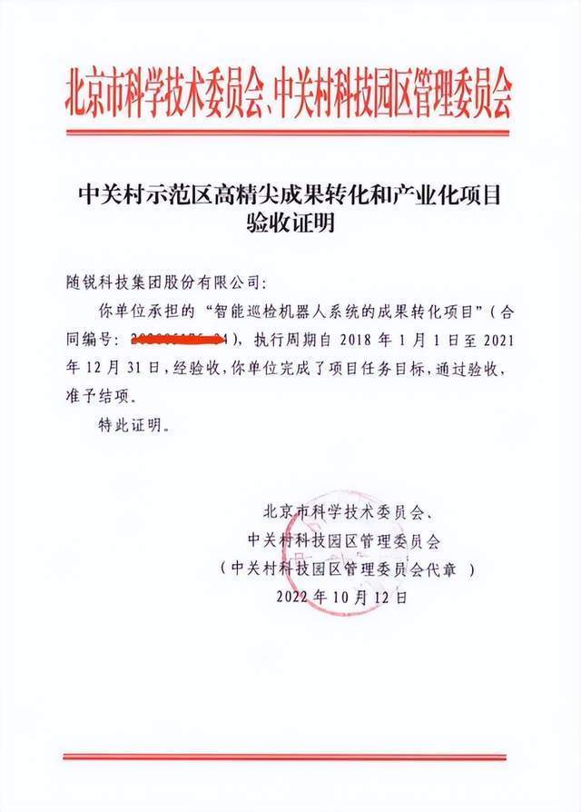 随锐科技集团承担的中关村示范区高精尖成果转化和产业化项目“智能巡检机器人系统的成果转化项目”顺利通过验收