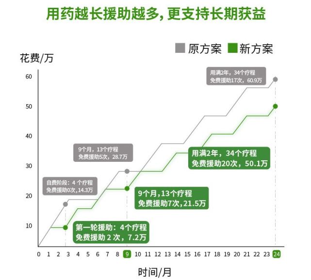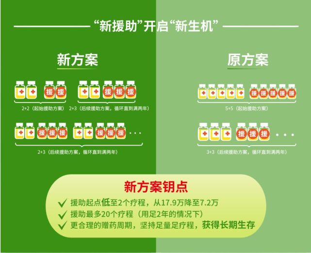 方案“3+3”,即购买3次疗程后,可享受3次援助,一直循环直到进展或者用满2年。新方案“2+3”,即只需自费购买2次疗程,也有3次免费援助药品,持续规范治疗的时间越长,后续自费比例更低,疗效持续时间也更长,即使后续更换治疗方案也能持续获益。新方案也是循环直到进展或者用满2年。
