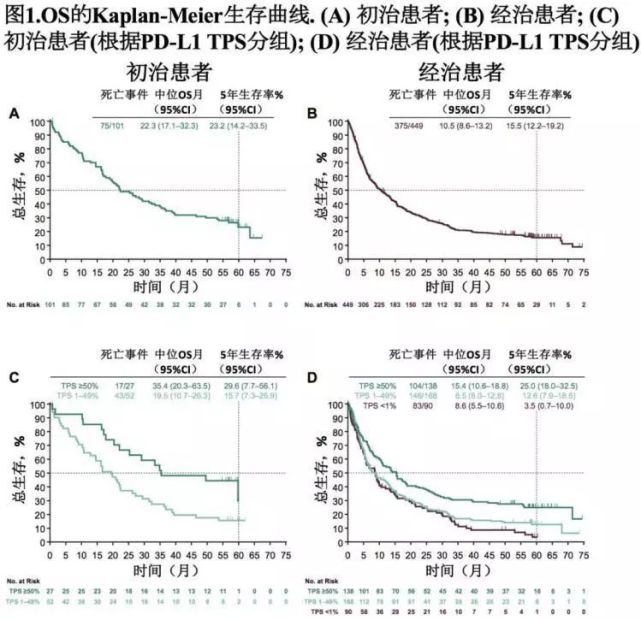 对初治的晚期肺癌患者,一线治疗使用K药的5年生存率为23.2%。而过往历史数据,晚期肺癌5年生存率仅为5%左右,K药将这一数字提高了近4倍!当然,PD-L1高表达的患者有更好的生存获益,TPS≥50%的初治患者5年生存率为29.6%, 约为历史数据的6倍。