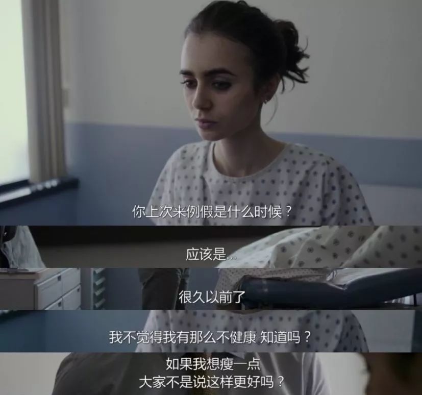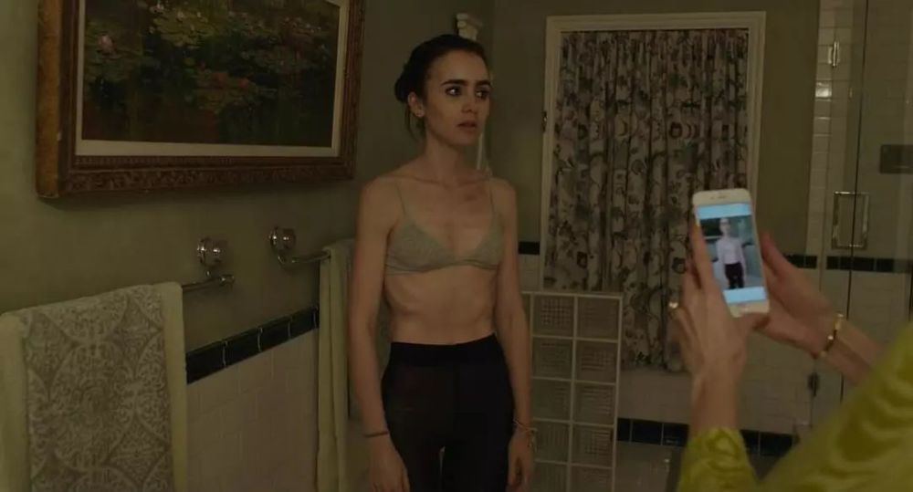 Lily Collins前两年演过一个电影叫《To the Bone》(中文名叫《骨瘦如柴》),讲述了一群进食障碍者的故事。Lily饰演的女孩Alen因为各种原因患上了严重的厌食症,她认为别人是因为才华和美丽才喜欢她,对瘦的追求十分病态:她喜欢用手指圈起来测量手臂的围度,瘦到胳膊只有一枚硬币那么细;她可以把食物热量表倒背如流;疯狂做仰卧起坐到背上一片淤青也不肯停……康复中心的其他病患也跟她无异:因为催吐流产、东西吃两口就吐出来、吃泻药、抠吐、在床底藏呕吐物袋子......