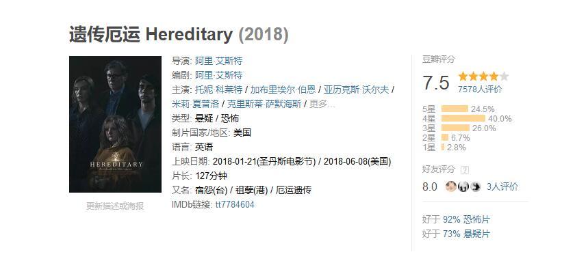 虽然目前豆瓣评分已经跌到7.5,但《遗传厄运》依然无愧今年以来最好恐怖片的赞誉!