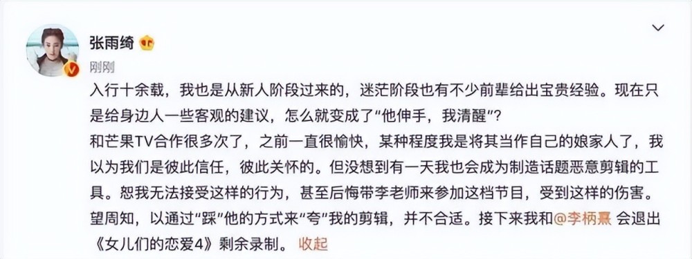 同样的在《女儿们的恋爱4》的恋爱上,面对节目组有争议的剪辑,张雨绮一怒为蓝颜,发文喊话硬钢,与导演组一度撕破脸面,甚至最后退出录制。
