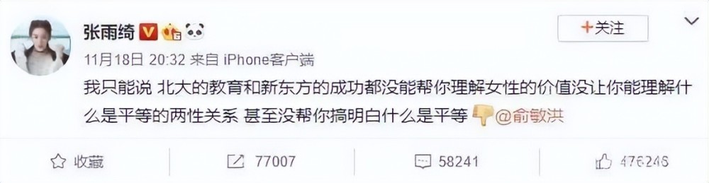 当俞敏洪发表了不妥的“女性堕落论”,张雨绮作为公众人物,更是首当其冲站出来,一点也不客气地公开发博开怼俞敏洪: