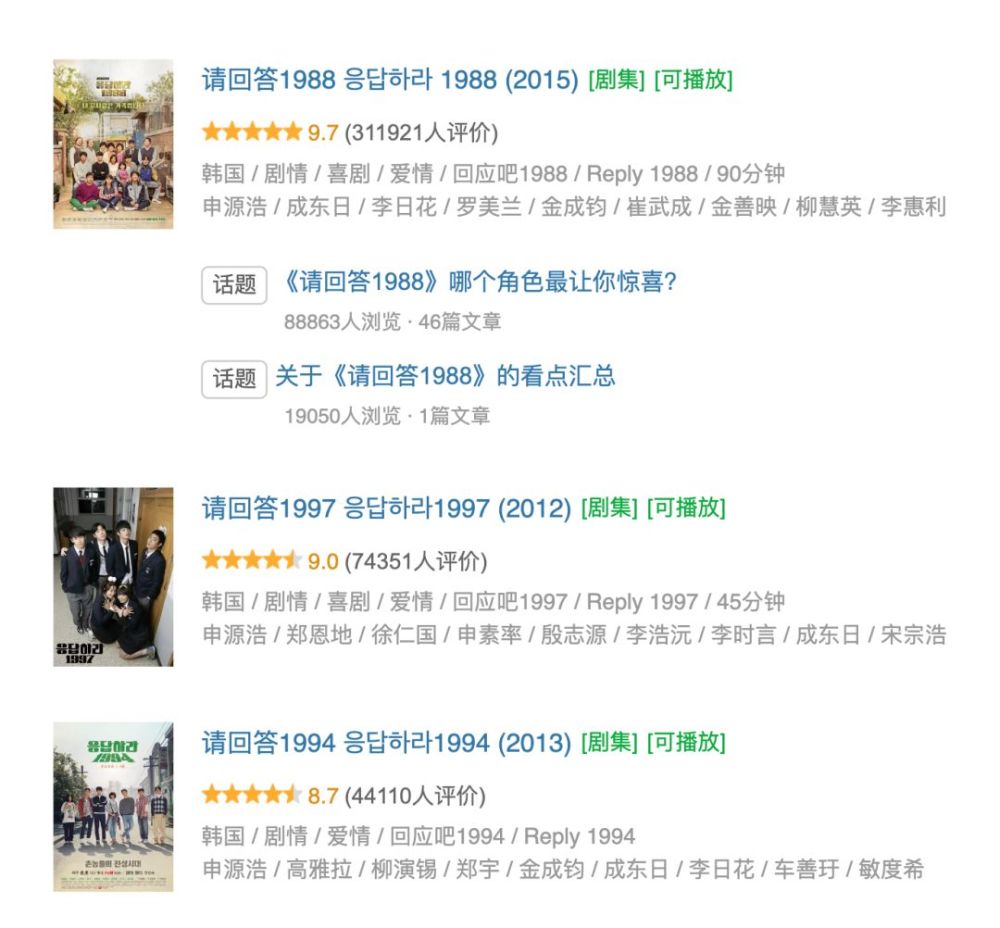 “请回答”系列电视剧在豆瓣上一直保持着高分。