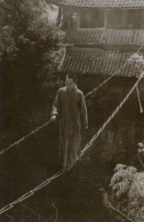 30年代,四川江油窦团山上的寺庙,僧侣以简易的铁索为桥,踏索越堑。