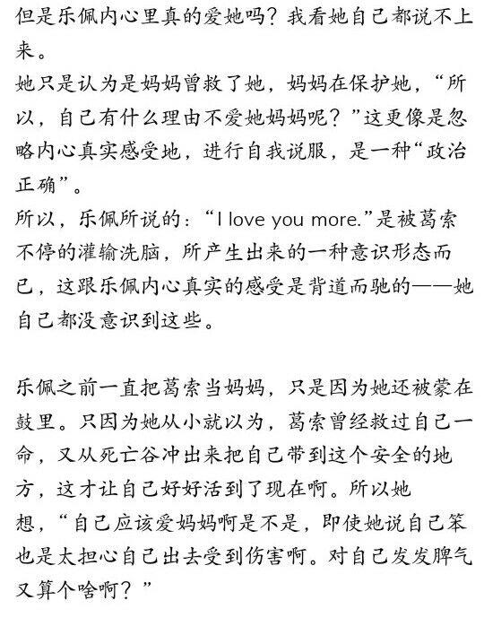 结合上面的情感虐待(Emotional Abuse),所以说,在乐佩得知真相以前,她为了“妈妈的爱”,为了“爱妈妈”。她一直在承受着这些(感情虐待恐吓自我否定,以及对未来无尽的高塔生活的彷徨,等等),为了这种痛苦的“爱”,她的心一直被伤害着,但那时因为她不知情,她毫不会怪葛索。