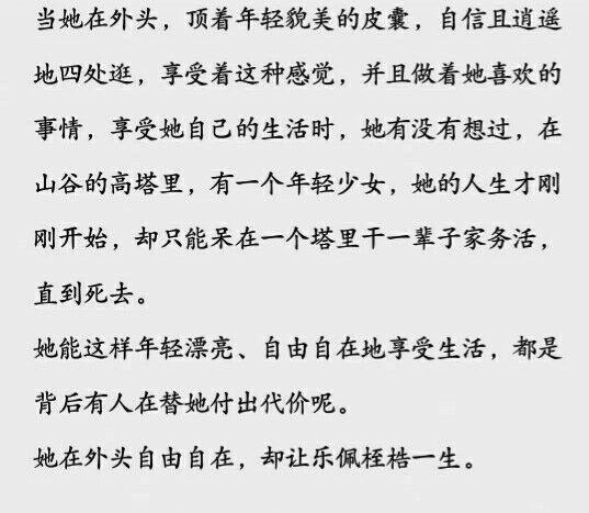 抛开王宫里的教育条件和物质条件不谈(不然又有人要扯什么乐佩傍有钱父母嫌弃穷“养母”了,但事实上根本没有证据能证明困在塔里18年的乐佩知道公主的生活是什么样的,毕竟她跟外界是隔绝的啊),人家本来是有真正疼爱她的父母的,人家本来是自由自在的,有一个正常人基本的人身自由,而不是18年如一日天天被关在塔里不能像正常人一样和外界接触,每天除了干完家务,就是重复那些事。一潭死水的生活令人感觉如同生命停止了一般。乐佩和你我一样,她需要新鲜的血液。