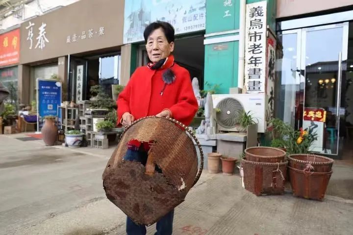 冯爱倩展示四十年前装载小商品的箩筐