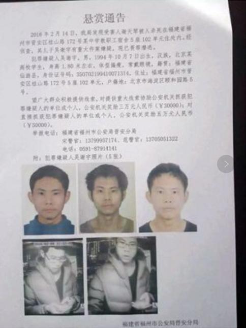 2016年3月3日,警方在吴谢宇舅舅的报案下发现其母谢天琴死于福州一中学教工宿舍内,尸体被塑料布层层包裹,其中还放置了活性炭用于吸味。案发现场安置了两个摄像头和报警器连接到电脑,分别对着大门和主卧,可以通过手机查看室内情况。