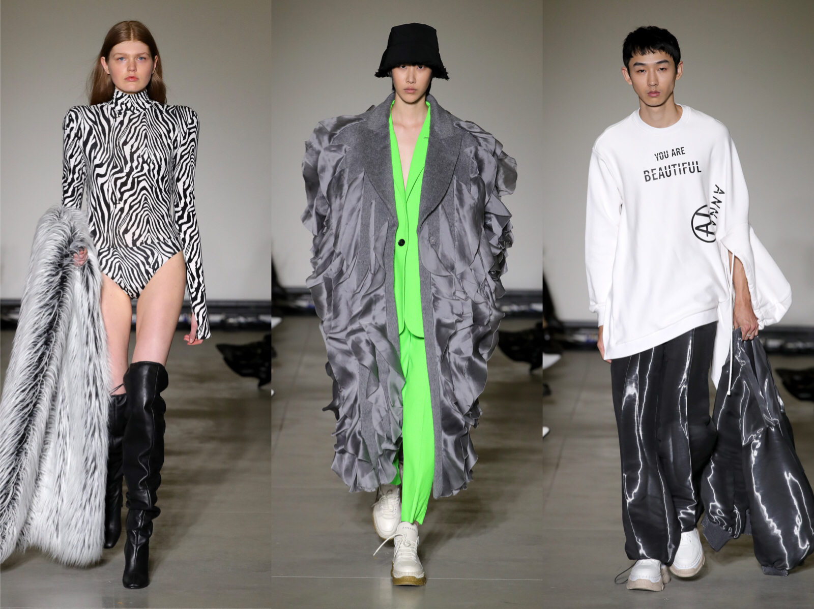 ANNAKIKI 发布2019A/W系列,这一季设计主题为“Embrace Imperfection(拥抱不完美)”,设计灵感来自美国纪录片《Miss Representation》。本季搜集了不太“完美”的人像进行印花,直接放大身体的不完美,并使用了“You’re beautiful ”“Not perfect” “Forgot the rules ”等slogan,去鼓励大家给周围的人多一些赞美与认可,抛开固化的审美标准,拥抱不完美。