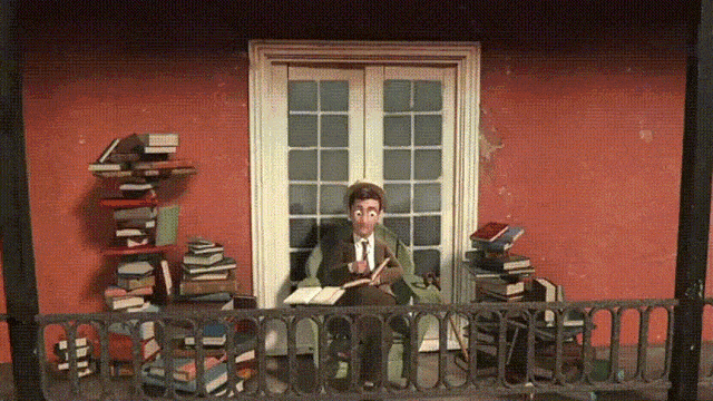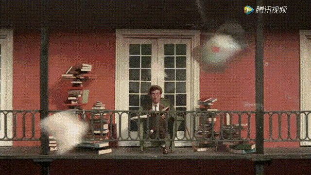 头戴礼帽的莫里斯先生在街区小旅馆的阳台上阅读。