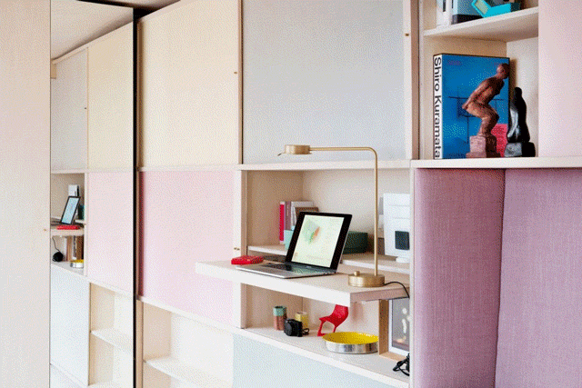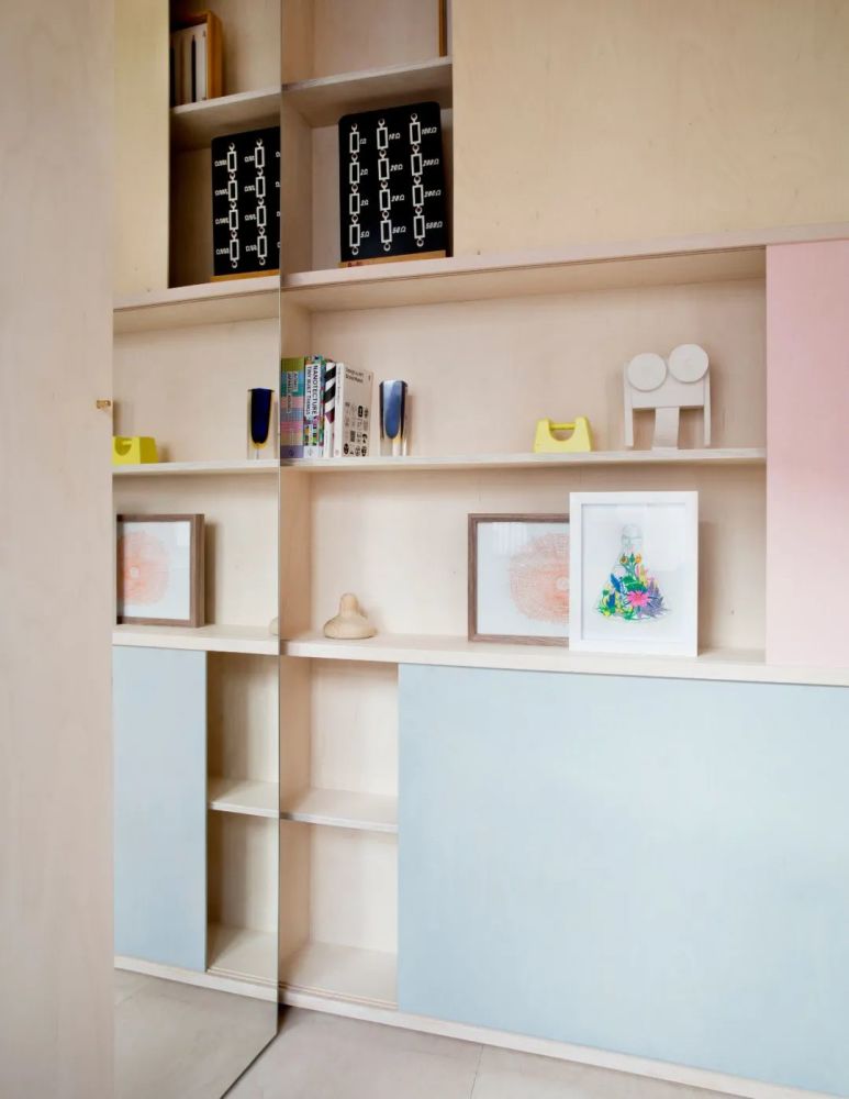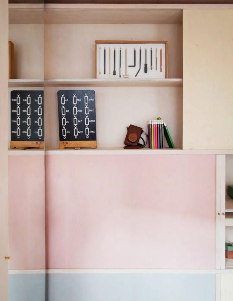 颜色柔和的柜子基本上代表整屋的风格,淡黄色、粉红色、浅灰蓝色的推拉门里面是大小不一的格子。