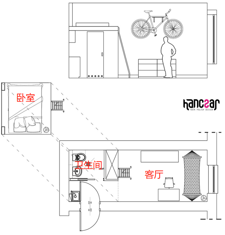 上方是双人床铺,大多功能区都集中在下方,小厨房、卫生间、客厅、餐厅,还有大收纳柜。