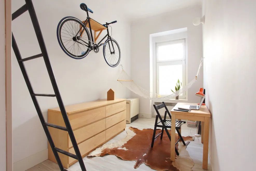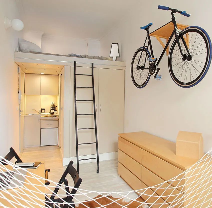 墙上挂的自行车,也能给小空间增添不少趣味。